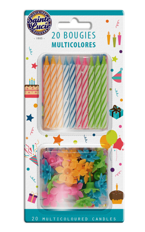 20 Bougies d’Anniversaire multicolores et bobèches.