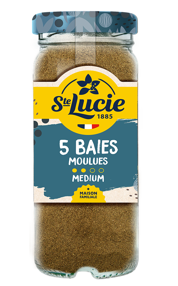 Le mélange 5 baies traditionnel associe poivres noir, blanc et vert, baies roses et piment de Jamaïque. Sainte Lucie y ajoute des graines de coriandre pour une note de fraîcheur. Déjà moulues, elles s’intègrent parfaitement dans toutes vos recettes.