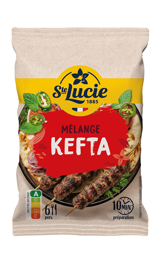 « Brochettes de kefta Dosage : 6 personnes Temps de préparation : 10 min Marinade : 3 à 4 h Temps de cuisson : 10 min Ingrédients : 6 piques à brochette / 600 g de viande hachée de bœuf / 1 oignon émincé finement / 1/2 bouquet de coriandre frais / 2 c. à soupe d’huile d’olive / 1 sachet de mélange Kefta Sainte Lucie 1/ Dans un saladier, mélangez la viande hachée avec l’oignon émincé, la coriandre ciselée, le mélange d’épices Kefta et l’huile d’olive. 2/ Laissez reposer au frais entre 3 et 4 heures pour que la viande s’imprègne de la marinade. 3/ Formez 24 boulettes puis placez-en 4 par brochette. 4/ Faites griller à la poêle 8 à 10 minutes à feu vif. »